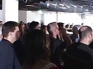 "Audience watches with joy as the three sluts receive DP during the foursome on stage"