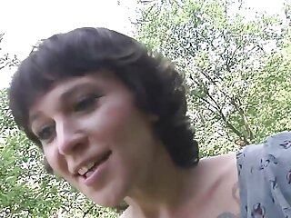 "Tattooed milf with small tits gets spitroasted outdoors"